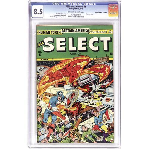 <B>All Select Comics #6 Davis Crippen ("D" Copy) pedigree (Timely, 1945) CGC VF+ 8.5 Off-white to white pages.</B></I> Alex Schomburg covers tend to be worth staring at for a long time to appreciate all of the detail the artist included. This time "robot bombs" are the threat, with Captain America and the Human Torch taking on master plan-thwarting duties. The Destroyer rounded out this issue's roster. Overstreet 2006 VF 8.0 value = $925; VF/NM 9.0 value = $1,463. CGC census 6/06: 1 in 8.5, 1 higher. <I>From the Crippen Collection.</B></I> <BR><BR><B>Important notice:</B> Heritage usually auctions material at the rate of 200-250 lots per hour. On some occasions eBay Live bid software or the Internet may not be able to keep up with the pace of the auction. We recommend placing a realistic absentee bid now as insurance to avoid disappointment. Occasionally the auctioneer may eliminate or reject an eBay Live bid, and the auctioneer may also reopen a lot after the close of the eBay live bidding (usually because we missed an audience bid), and may reject your bid even if it shows you as the winning bidder. By bidding via eBay Live, you agree that Heritage may award the lot to another bidder at its sole discretion under the circumstances described above or any other reasonable circumstances. Since eBay bids are not shown to us until we open the lot on the floor, we treat those bids just like floor bids. In most cases the floor responds before the eBay bid is presented to us, due to Internet lag time, so for consistency we have made it a policy that floor bids are always considered first over tie eBay live bids. Also please note that all Heritage lots purchased through eBay Live carry a 22.5% Buyer's Premium. Please make sure you read the Terms and Conditions before you bid. This lot is being auctioned in conjunction with a live floor auction by Heritage Auction Galleries. All final auction and invoice information will be supplied by Heritage Auction Galleries, and all other information should be considered preliminary. Lot:41001 <BR><BR><B>Winning Notification and Billing:</B> After the FINAL session in this auction is complete, Heritage will send e-mail and snail mail invoices. This process normally takes several days. All final auction and invoice information will be supplied by Heritage Auction Galleries, and all other information should be considered preliminary. <BR><BR>This auction will be conducted on a live auction floor and over the Internet through eBay Live. If you choose to place an absentee bid, please take a moment to <font color='#0000ff'><u><a href='http://pages.ebay.com/liveauctions/help/before/laabsentee.html'>learn how eBay Live absentee bidding works</a></u></font><font color='#000000'>