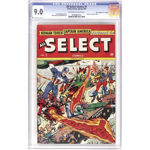 <B>All Select Comics #7 Davis Crippen ("D" Copy) pedigree (Timely, 1945) CGC VF/NM 9.0 Off-white to white pages.</B></I> This copy's sharp front cover makes it one any Timely fan would be proud to own, all the more so because of the Alex Schomburg cover art. The issue stars Captain America, the Human Torch, and the Whizzer. Overstreet 2006 VF/NM 9.0 value = $1,463; NM- 9.2 value = $2,000. CGC census 6/06: 2 in 9.0, none higher. <I>From the Crippen Collection.</B></I> <BR><BR><B>Important notice:</B> Heritage usually auctions material at the rate of 200-250 lots per hour. On some occasions eBay Live bid software or the Internet may not be able to keep up with the pace of the auction. We recommend placing a realistic absentee bid now as insurance to avoid disappointment. Occasionally the auctioneer may eliminate or reject an eBay Live bid, and the auctioneer may also reopen a lot after the close of the eBay live bidding (usually because we missed an audience bid), and may reject your bid even if it shows you as the winning bidder. By bidding via eBay Live, you agree that Heritage may award the lot to another bidder at its sole discretion under the circumstances described above or any other reasonable circumstances. Since eBay bids are not shown to us until we open the lot on the floor, we treat those bids just like floor bids. In most cases the floor responds before the eBay bid is presented to us, due to Internet lag time, so for consistency we have made it a policy that floor bids are always considered first over tie eBay live bids. Also please note that all Heritage lots purchased through eBay Live carry a 22.5% Buyer's Premium. Please make sure you read the Terms and Conditions before you bid. This lot is being auctioned in conjunction with a live floor auction by Heritage Auction Galleries. All final auction and invoice information will be supplied by Heritage Auction Galleries, and all other information should be considered preliminary. Lot:41001 <BR><BR><B>Winning Notification and Billing:</B> After the FINAL session in this auction is complete, Heritage will send e-mail and snail mail invoices. This process normally takes several days. All final auction and invoice information will be supplied by Heritage Auction Galleries, and all other information should be considered preliminary. <BR><BR>This auction will be conducted on a live auction floor and over the Internet through eBay Live. If you choose to place an absentee bid, please take a moment to <font color='#0000ff'><u><a href='http://pages.ebay.com/liveauctions/help/before/laabsentee.html'>learn how eBay Live absentee bidding works</a></u></font><font color='#000000'>