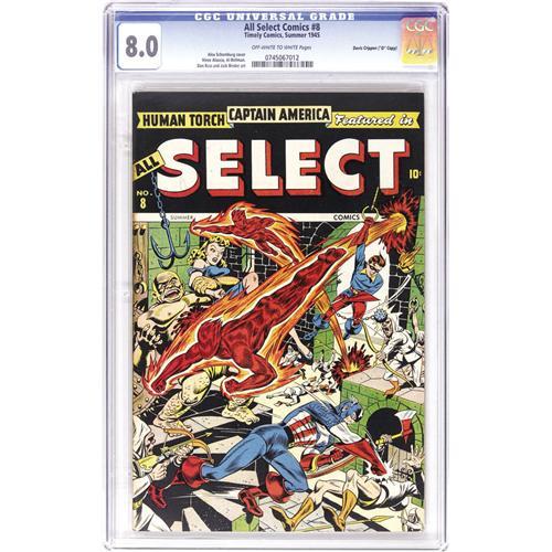 <B>All Select Comics #8 Davis Crippen ("D" Copy) pedigree (Timely, 1945) CGC VF 8.0 Off-white to white pages.</B></I> Alex Schomburg's cover art is always a draw, and the few that had a damsel in distress in the mix never fail to please. The Human Torch and Captain America each appear in a story inside, as does Jap-Buster Johnson. Overstreet 2006 VF 8.0 value = $925. CGC census 6/06: 1 in 8.0, 3 higher. <I>From the Crippen Collection.</B></I> <BR><BR><B>Important notice:</B> Heritage usually auctions material at the rate of 200-250 lots per hour. On some occasions eBay Live bid software or the Internet may not be able to keep up with the pace of the auction. We recommend placing a realistic absentee bid now as insurance to avoid disappointment. Occasionally the auctioneer may eliminate or reject an eBay Live bid, and the auctioneer may also reopen a lot after the close of the eBay live bidding (usually because we missed an audience bid), and may reject your bid even if it shows you as the winning bidder. By bidding via eBay Live, you agree that Heritage may award the lot to another bidder at its sole discretion under the circumstances described above or any other reasonable circumstances. Since eBay bids are not shown to us until we open the lot on the floor, we treat those bids just like floor bids. In most cases the floor responds before the eBay bid is presented to us, due to Internet lag time, so for consistency we have made it a policy that floor bids are always considered first over tie eBay live bids. Also please note that all Heritage lots purchased through eBay Live carry a 22.5% Buyer's Premium. Please make sure you read the Terms and Conditions before you bid. This lot is being auctioned in conjunction with a live floor auction by Heritage Auction Galleries. All final auction and invoice information will be supplied by Heritage Auction Galleries, and all other information should be considered preliminary. Lot:41001 <BR><BR><B>Winning Notification and Billing:</B> After the FINAL session in this auction is complete, Heritage will send e-mail and snail mail invoices. This process normally takes several days. All final auction and invoice information will be supplied by Heritage Auction Galleries, and all other information should be considered preliminary. <BR><BR>This auction will be conducted on a live auction floor and over the Internet through eBay Live. If you choose to place an absentee bid, please take a moment to <font color='#0000ff'><u><a href='http://pages.ebay.com/liveauctions/help/before/laabsentee.html'>learn how eBay Live absentee bidding works</a></u></font><font color='#000000'>