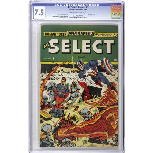 <B>All Select Comics #9 (Timely, 1945) CGC VF- 7.5 Off-white to white pages.</B></I> By the fall of 1945, Golden Age Master Alex Schomburg was running out of WWII themes... enter some of the weirdest aliens <I>ever</B></I>! But it's still Schomburg and so it's beyond cool! Vince Alascia and Al Bellman contributed interior artwork, and we have a nice copy of the whole thing! Overstreet 2006 VF 8.0 value = $925. CGC census 10/06: 1 in 7.5, 6 higher.<BR><BR><b>Shipping:</b> Slabbed Comic (<a target="_blank" href="http://www.heritageauctions.com/common/shipping.php">view shipping information</a>)