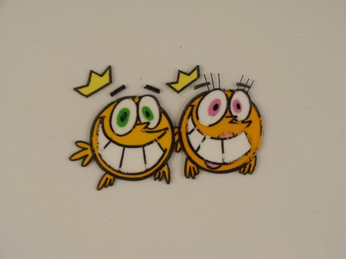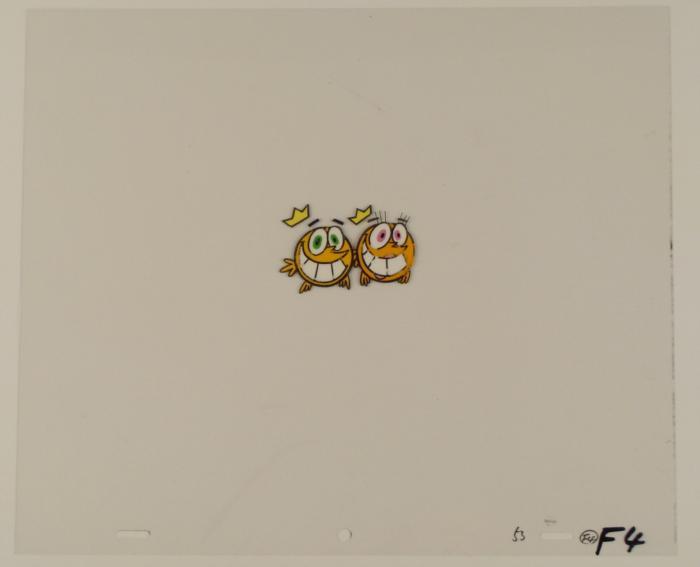This original animation cel is from the Nickelodeon TV show Fairly Odd Parents. Timmy Turner is a short, buck-toothed 10-year-old boy with a pink cap who lives in Dimmsdale, a small suburban town with his dim-witted parents. His life is constantly miserable, due to the fact that his parents are rarely home and he is babysat by an incredibly evil teenager, Vicky, and that, generally, no one understands him (as indicated by the show's theme song). But everything changes when he receives two fairy parents: Cosmo and his wife, Wanda and later, their son Poof. Timmy learns that his fairy godparents are capable of granting him any wish he wants within certain limits. However, Timmy's immature nature causes him to sometimes ask for wishes that unintentionally result in disaster, and he and his fairy parents and fairy brother must find a way to "unwish" the wish. Aren't Wanda and Cosmo such a happy, loving couple?Original Production Animated Cel Overall Size of Cel: 10 1/2" x 12 1/2" Very Good ConditionThis is an original hand-painted cel set-up used in the production of an episode of "Fairly Odd Parents." Each one-of-a-kind set-up represents a slight change in position of the characters. When individually photographed and projected in rapid succession, the images appear to move.
