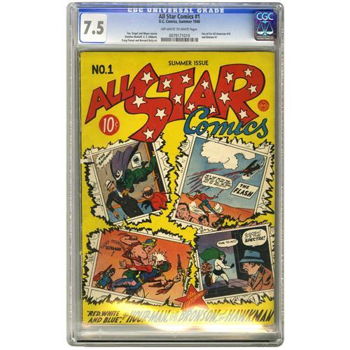<B>All Star Comics #1 (DC, 1940) CGC VF- 7.5 Off-white to white pages.</B></I> Where were all the superheroes before the formation of the Justice Society of America? Why, hanging out in the pages of this anthology title! Featuring the Flash by E. E. Hibbard, Hawkman by Shelly Moldoff, Hourman by Bernard Baily, the Sandman by Creig Flessel, the Spectre by Bernard Baily, as well as second-tier characters like Biff Bronson, Red White and Blue, and Ultra Man, this comic is packed with good stories and great characters. No wonder they decided to team up by the third issue! This comic comes in at #70 in Overstreet's 2005 list of Top Golden Age Books. Overstreet 2006 VF 8.0 value = $8,603. CGC census 3/06: 2 in 7.5, 5 higher.