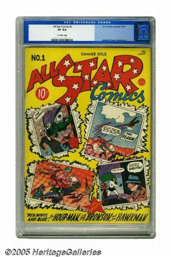 <B>All Star Comics #1 (DC, 1940) CGC VF 8.0 Off-white pages.</B></I> Very nice copy of this key DC Golden Age book. Just one copy has managed a grade higher than VF/NM 9.0 from CGC to date. Comic artist pioneers Bernard Baily (Hourman and the Spectre stories), Sheldon Moldoff (Hawkman), and E. E. Hibbard (the Flash) contributed their talents to this first issue, two issues before DC's superheroes joined forces to form the Justice Society. Overstreet 2005 VF 8.0 value = $8,603. CGC census 5/05: 1 in 8.0, 4 higher.
