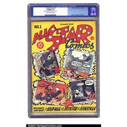 All Star Comics #1 (DC, 1940) CGC VF/NM 9.0 Cream to off-white pages. This inaugural issue kicked off one of DC's most seminal series, which would introduce comicdom's first superhero team, the JSA, in issue #3. The first two issues featured separate stories of DC's more popular characters, including Sandman, Flash and the Spectre. This copy is very clean with a tight spine, and suffers only from rounded corners. Overstreet 2002 NM 9.4 value = $16,500. Important notice: We expect to be auctioning lots at the rate of 200-250 per hour. Sometimes eBay Premier live bid software cannot keep up with that pace, so we strongly recommend that you place a realistic proxy bid now as insurance to avoid disappointment. Also please note that all Heritage/CAA lots purchased through eBay Premier carry a 20% Buyer's Premium. Please make sure you read the Terms and Conditions.