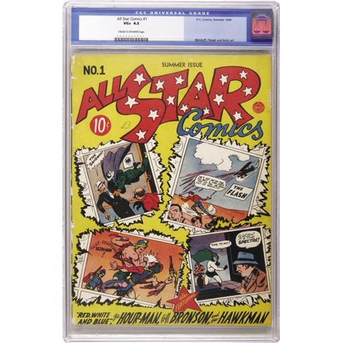 <B>All Star Comics #1 (DC, 1940) CGC VG+ 4.5 Cream to off-white pages.</B></I> Not an easy issue to find in high grade, and in the past year we've only offered two other copies of this milestone book. Three of DC's stalwart artists of the day, Harry Lampert, Bernard Baily, and Creig Flessel combined for the montage cover, and Baily, Flessel, and Sheldon Moldoff contributed story art. Although the Justice Society hadn't been formed yet, some of the individuals were featured in solo adventures, including the Flash, the Spectre, Hourman, Hawkman, and the Sandman. Overstreet 2006 VG 4.0 value = $2,294. CGC census 10/06: 3 in 4.5, 15 higher.<BR><BR><b>Shipping:</b> Slabbed Comic (<a target="_blank" href="http://www.heritageauctions.com/common/shipping.php">view shipping information</a>)