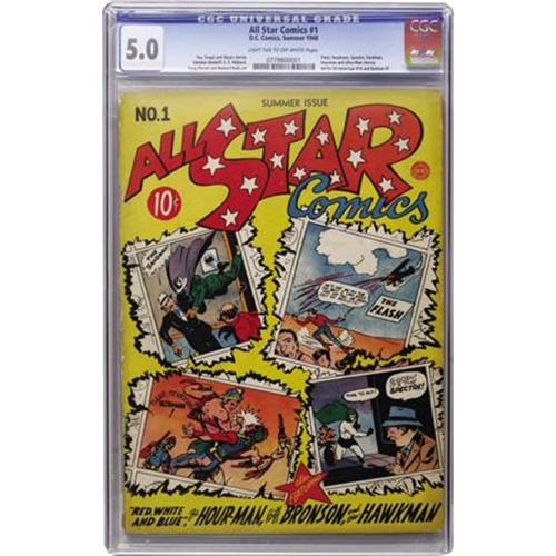 <B>All Star Comics #1 (DC, 1940) CGC VG/FN 5.0 Light tan to off-white pages.</B></I> DC brought together several major stars of its All-American line -- including the Flash, the Spectre, Hourman, and Hawkman -- for this new anthology title. By the famous third issue, <B>All-Star </B></I>became home to the Justice Society of America. This key issue also includes house ads for <B>All-American Comics</B></I> #16 (which introduced the Green Lantern, the replacement for muscle-bound Gary Concord, Ultra-Man) and <B>Batman</B></I> #1. This unrestored copy displays some wear, but is still quite attractive. Overstreet 2007 VG 4.0 value = $2,324; FN 6.0 value = $3,486. CGC census 6/07: 2 in 5.0, 13 higher.<BR><BR><b>Shipping:</b> Comics - Slabbed (certified) (<a target="_blank" href="http://www.heritageauctions.com/common/shipping.php">view shipping information</a>)