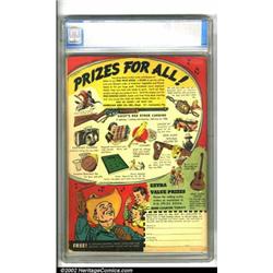 All-Star Comics #10 (DC, 1942). This has always been one of the toughest issues of this popular title to acquire, with a fantastic Hawkman cover and cameos by DC super-stars Batman and Superman. A beautiful copy with a nice general appearance, highlighted by an attractive cover and solid spine. CGC notes "Small piece of tape on interior cover, 'read' written on 10 pages in pen". CGC Fine+ 6.5 Off-white pages. Overstreet 2001 FN 6.0 value = $885. Important notice: We expect to be auctioning lots at the rate of 200-250 per hour. Sometimes eBay Premier live bid software cannot keep up with that pace, so we strongly recommend that you place a realistic proxy bid now as insurance to avoid disappointment. Also please note that all Heritage/CAA lots purchased through eBay Premier carry a 20% Buyer's Premium.