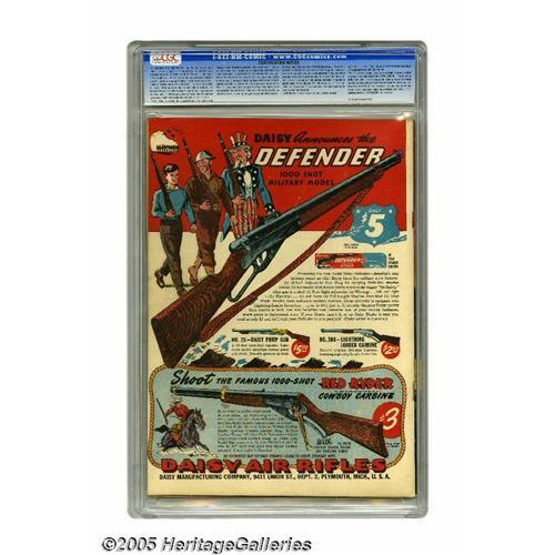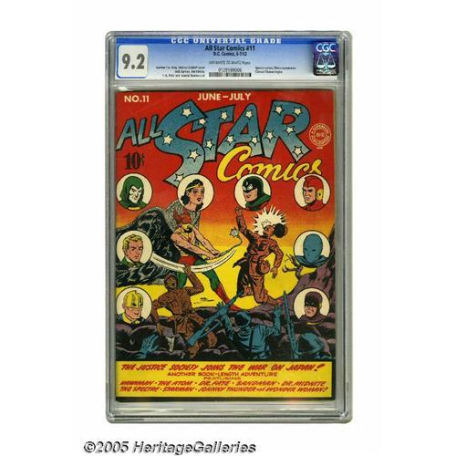 <B>All Star Comics #11 (DC, 1942) CGC NM- 9.2 Off-white to white pages.</B></I> Stunning cover colors on this copy, which is close to the finest specimen CGC has certified yet for #11. Sheldon Moldoff created the nifty cover, which features an image of Wonder Woman for the first time in this title. Her feature also begins in this issue, which also has appearances by Shiera and the Spectre. Interior artists include Jack Burnley, H. G. Peter, and Howard Sherman. Overstreet 2005 NM- 9.2 value = $3,800. CGC census 7/05: 1 in 9.2, 2 higher. <I>From the Aviator Collection</B></I>. <BR><BR><B>Important notice:</B> Heritage usually auctions material at the rate of 200-250 lots per hour. On some occasions eBay Live bid software or the Internet may not be able to keep up with the pace of the auction. We recommend placing a realistic absentee bid now as insurance to avoid disappointment. Occasionally the auctioneer may eliminate or reject an eBay Live bid, and the auctioneer may also reopen a lot after the close of the eBay live bidding (usually because we missed an audience bid), and may reject your bid even if it shows you as the winning bidder. By bidding via eBay Live, you agree that Heritage may award the lot to another bidder at its sole discretion under the circumstances described above or any other reasonable circumstances. Since eBay bids are not shown to us until we open the lot on the floor, we treat those bids just like floor bids. In most cases the floor responds before the eBay bid is presented to us, due to Internet lag time, so for consistency we have made it a policy that floor bids are always considered first over tie eBay live bids. Also please note that all Heritage lots purchased through eBay Live carry a 20% Buyer's Premium. Please make sure you read the Terms and Conditions before you bid. This lot is being auctioned in conjunction with a live floor auction by Heritage Galleries & Auctioneers. All final auction and invoice information will be supplied by