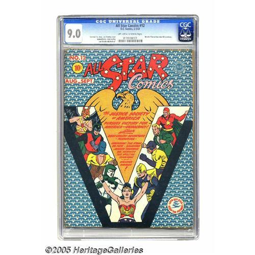 <B>All Star Comics #12 (DC, 1942) CGC VF/NM 9.0 Off-white to white pages.</B></I> Only three copies of this issue have been graded higher by CGC as of this writing. This Justice Society tale has Wonder Woman being appointed the official secretary of the JSA and an honorary member of the group. The issue has a Jack Burnley cover and interior art by Burnley, Sheldon Moldoff, and Bernard Baily. Overstreet 2005 VF/NM 9.0 value = $2,519; NM- 9.2 value = $3,400. CGC census 7/05: 1 in 9.0, 3 higher. <I>From the Aviator Collection</B></I>. <BR><BR><B>Important notice:</B> Heritage usually auctions material at the rate of 200-250 lots per hour. On some occasions eBay Live bid software or the Internet may not be able to keep up with the pace of the auction. We recommend placing a realistic absentee bid now as insurance to avoid disappointment. Occasionally the auctioneer may eliminate or reject an eBay Live bid, and the auctioneer may also reopen a lot after the close of the eBay live bidding (usually because we missed an audience bid), and may reject your bid even if it shows you as the winning bidder. By bidding via eBay Live, you agree that Heritage may award the lot to another bidder at its sole discretion under the circumstances described above or any other reasonable circumstances. Since eBay bids are not shown to us until we open the lot on the floor, we treat those bids just like floor bids. In most cases the floor responds before the eBay bid is presented to us, due to Internet lag time, so for consistency we have made it a policy that floor bids are always considered first over tie eBay live bids. Also please note that all Heritage lots purchased through eBay Live carry a 20% Buyer's Premium. Please make sure you read the Terms and Conditions before you bid. This lot is being auctioned in conjunction with a live floor auction by Heritage Galleries & Auctioneers. All final auction and invoice information will be supplied by Heritage Galleries & Auctioneers, and all o