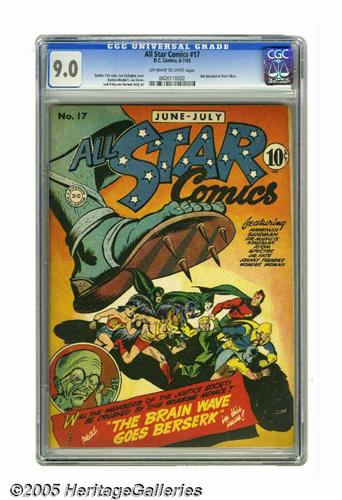 <B>All Star Comics #17 (DC, 1943) CGC VF/NM 9.0 Off-white to white pages.</B></I> From the eye-catching cover by Joe Gallagher to interior art from Joe Simon, Jack Kirby, Sheldon Moldoff, and Bernard Baily, this issue's chock-full of DC Golden Age greatness, including the second appearance of Brain Wave. Our copy ain't shabby either - the second-highest graded copy CGC has certified to date. Overstreet 2005 VF/NM 9.0 value = $1,741; NM- 9.2 value = $2,350. CGC census 7/05: 1 in 9.0, 1 higher.