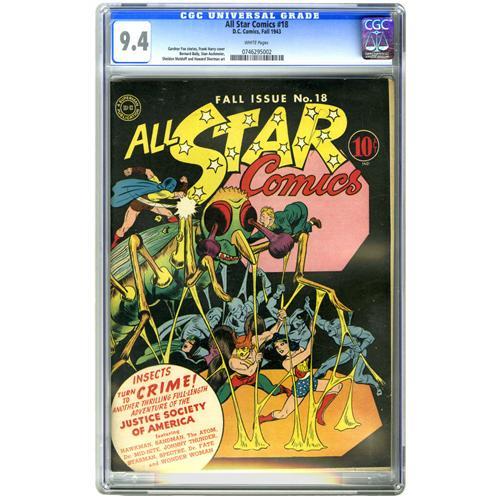 <B>All Star Comics #18 (DC, 1943) CGC NM 9.4 White pages.</B></I> This may be the best copy in existence of this book -- it's tied for the highest grade CGC has assigned, and we haven't seen one with such an immaculate cover before. The page quality is great, too. In this issue, the Justice Society takes on the King Bee -- a face-off that was echoed 20 years later when the Justice <I>League</B></I> often had to face the <I>Queen</B></I> Bee! You'll notice that the cover says "Fall issue" -- wartime paper shortages were such that this monthly was forced to become a quarterly for a while. Overstreet 2006 NM- 9.2 value = $2,500. CGC census 3/06: 3 in 9.4, none higher.