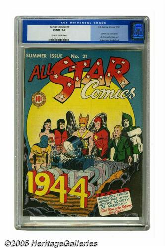 <B>All Star Comics #21 (DC, 1944) CGC VF/NM 9.0 Off-white to white pages.</B></I> The Spectre and the Atom make cameo appearances in this issue, while Dr. Fate and the Sandman end their tour. Joe Gallagher on the cover, and Sheldon Moldoff and Joe Kubert on the interior, are the featured artists. Overstreet 2005 VF/NM 9.0 value = $1,519; NM- 9.2 value = $2,050. CGC census 5/05: 2 in 9.0, 2 higher.