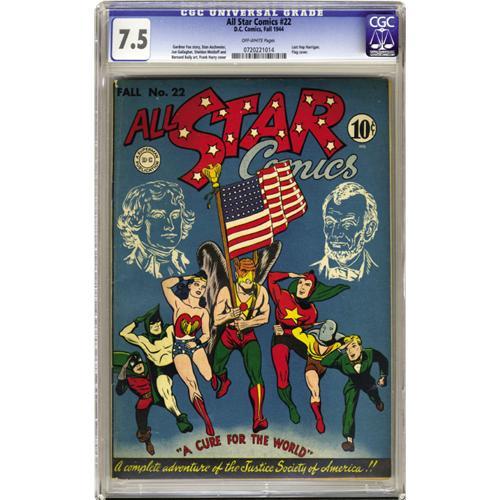 <B>All Star Comics #22 (DC, 1944) CGC VF- 7.5 Off-white pages.</B></I> A patriotic flag cover by Frank Harry is the attention-getter here; inside the issue there's art by Sheldon Moldoff on the Hawkman chapter. Overstreet notes that this issue had the last of the series of Hop Harrigan text features. Overstreet 2006 VF 8.0 value = $994. CGC census 03/06: 2 in 7.5, 4 higher.