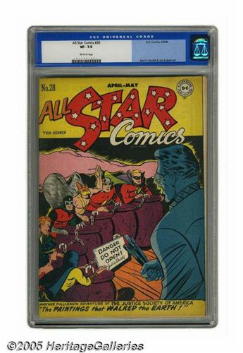 <B>All Star Comics #28 (DC, 1946) CGC VF- 7.5 Off-white pages.</B></I> They say that great artists make their paintings "come to life," but in this issue some paintings literally come to life, as in battling the JSA! As for artists of the comic book variety, this issue's pencil-wielders include Joe Kubert, who drew the Hawkman chapter. The CGC slab lists Martin Nodell among the artists, but note that while Nodell did work on some early <B>All-Star</B></I> issues, the contributor here is actually the similarly named Martin Naydel, a prolific DC artist in his own right. The cover is by Naydel as well. Overstreet 2005 VF 8.0 value = $756. CGC census 4/05: 2 in 7.5, 3 higher.