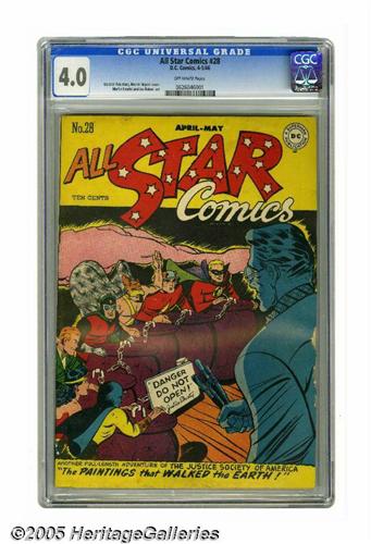 <B>All Star Comics #28 (DC, 1946) CGC VG 4.0 Off-white pages.</B></I> The superteam encounters "the Paintings that Walked the Earth" in this issue, scripted by Garner Fox. Martin Naydel and Joe Kubert art. Overstreet 2005 VG 4.0 value = $242. CGC census 7/05: 2 in 4.0, 8 higher.