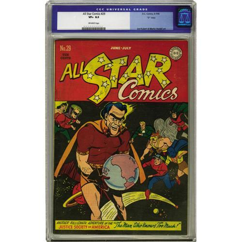 <B>All Star Comics #29 "D" Copy pedigree (DC, 1946) CGC VF+ 8.5 Off-white pages.</B></I> Who's got the world in the palm of his hands? It's "The Man Who Knows Too Much," and he's got the Justice Society hopping -- through the inky-black depths of space, on this Martin Naydel cover. Joe Kubert art is featured inside. Overstreet 2006 VF 8.0 value = $763; VF/NM 9.0 value = $1,207. CGC census 3/06: 3 in 8.5, 5 higher.