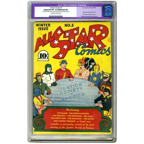 <B>All Star Comics #3 (DC, 1940) CGC Apparent VF+ 8.5 Moderate (P) Off-white to white pages.</B></I> "A breakthrough concept, second in importance only to the creation of the super hero" is how Overstreet once summarized the significance of this issue, the first appearance of the Justice Society of America, the first superhero group in comics. Some have even advanced the theory that the concept was unprecedented in all of <I>fiction</B></I>, as even the Knights of the Round Table didn't hold meetings before joining to vanquish a common opponent! The cover image is one of the most famous in the history of comics, and it's been imitated and paid homage to on many occasions (E. E. Hibbard is generally credited with the cover art). In the story, each JSAer recounts a recent adventure, and different artists drew these various chapters, among them Sheldon Moldoff, Martin Nodell, and Bernard Baily. CGC notes, "Restoration includes: color touch, tear seals, split sealed, cleaned, reinforced." Overstreet 2006 GD 2.0 value = $3,611; VG 4.0 value = $7,222; FN 6.0 value = $10,833; VF 8.0 value = $27,600; VF/NM 9.0 value = $46,300.