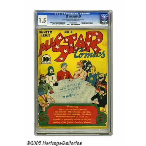 <B>All Star Comics #3 (DC, 1940) CGC FR/GD 1.5 Cream to off-white pages.</B></I> Notoriously difficult to find in high grade (only two copies to date have been certified by CGC higher than FN/VF 7.0), this Gerber ""uncommon"" issue currently ranks as the 13th most valuable Golden Age comic book, befitting the significance of the origin and first appearance of the Justice Society of America. The cover is by E. E. Hibbard, with Hibbard, Bernard Baily, Sheldon Moldoff, and Martin Nodel providing interior art. CGC notes, ""Front and back cover attached to interior with large piece of tape."" Overstreet 2005 GD 2.0 value = $3,529. CGC census 7/05: 1 in 1.5, 17 higher. <I>From the Aviator Collection</B></I>. <BR><BR><B>Important notice:</B> Heritage usually auctions material at the rate of 200-250 lots per hour. On some occasions eBay Live bid software or the Internet may not be able to keep up with the pace of the auction. We recommend placing a realistic absentee bid now as insurance to avoid disappointment. Occasionally the auctioneer may eliminate or reject an eBay Live bid, and the auctioneer may also reopen a lot after the close of the eBay live bidding (usually because we missed an audience bid), and may reject your bid even if it shows you as the winning bidder. By bidding via eBay Live, you agree that Heritage may award the lot to another bidder at its sole discretion under the circumstances described above or any other reasonable circumstances. Since eBay bids are not shown to us until we open the lot on the floor, we treat those bids just like floor bids. In most cases the floor responds before the eBay bid is presented to us, due to Internet lag time, so for consistency we have made it a policy that floor bids are always considered first over tie eBay live bids. Also please note that all Heritage lots purchased through eBay Live carry a 20% Buyer's Premium. Please make sure you read the Terms and Conditions before you bid. This lot is being auctioned in conjun