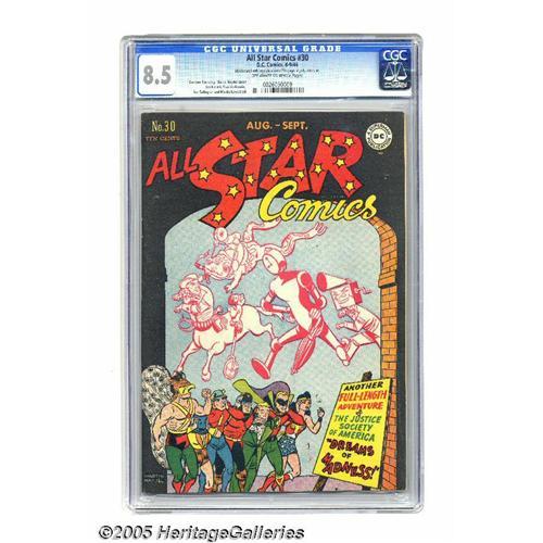 <B>All Star Comics #30 (DC, 1946) CGC VF+ 8.5 Off-white to white pages.</B></I> This copy, with its stunning black-background cover by Martin Naydel, looks much nicer than the CGC-assigned grade. This is due to a bindery defect; CGC notes, ""Manufactured with a large piece out of 5th page, slightly affects art."" Our advice is to snap up this beauty, leave it in its holder, and use some of the money you saved to buy a copy of " "<B>All Star Archives</B></I> #7 to read! Overstreet 2005 VF 8.0 value = $756; VF/NM 9.0 value = $1,166. CGC census 9/05: 1 in 8.5, 3 higher. <BR><BR><B>Important notice:</B> Heritage usually auctions material at the rate of 200-250 lots per hour. On some occasions eBay Live bid software or the Internet may not be able to keep up with the pace of the auction. We recommend placing a realistic absentee bid now as insurance to avoid disappointment. Occasionally the auctioneer may eliminate or reject an eBay Live bid, and the auctioneer may also reopen a lot after the close of the eBay live bidding (usually because we missed an audience bid), and may reject your bid even if it shows you as the winning bidder. By bidding via eBay Live, you agree that Heritage may award the lot to another bidder at its sole discretion under the circumstances described above or any other reasonable circumstances. Since eBay bids are not shown to us until we open the lot on the floor, we treat those bids just like floor bids. In most cases the floor responds before the eBay bid is presented to us, due to Internet lag time, so for consistency we have made it a policy that floor bids are always considered first over tie eBay live bids. Also please note that all Heritage lots purchased through eBay Live carry a 20% Buyer's Premium. Please make sure you read the Terms and Conditions before you bid. This lot is being auctioned in conjunction with a live floor auction by Heritage Galleries & Auctioneers. All final auction and invoice information will be supplied by Herita