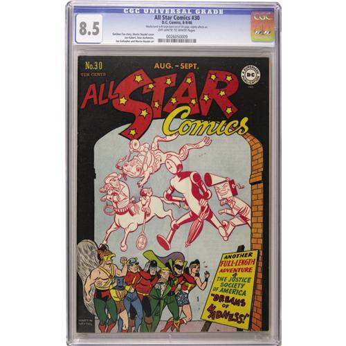 <B>All Star Comics #30 (DC, 1946) CGC VF+ 8.5 Off-white to white pages.</B></I> This title's covers were some of the more imaginative that DC created in the Golden Age. This one's by Martin Naydel, who also did some of the interior art, as did DC legend Joe Kubert. CGC notes, "Manufactured with large piece out of 5th page, slightly affects art." Overstreet 2006 VF 8.0 value = $763; VF/NM 9.0 value = $1,207. CGC census 11/06: 2 in 8.5, 3 higher.<BR><BR><b>Shipping:</b> Slabbed Comic (<a target="_blank" href="http://www.heritageauctions.com/common/shipping.php">view shipping information</a>)
