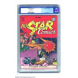 All Star Comics #31 (DC, 1946) CGC VF+ 8.5 Off-white to white pages. Consistently interesting covers characterized this title, but none perhaps was any stranger than this rendering by Martin Nodell. Marty also handled the interior artwork, with his interesting renditions of the Justice Society. This is a nice opportunity to bid on a book with a much higher visual appeal than the indicated grade, but which still ranks in the upper echelon of the grade structure. Overstreet 2002 VF 8.0 value = $769. Important notice: We expect to be auctioning lots at the rate of 200-250 per hour. Sometimes eBay Premier live bid software cannot keep up with that pace, so we strongly recommend that you place a realistic proxy bid now as insurance to avoid disappointment. Also please note that all Heritage/CAA lots purchased through eBay Premier carry a 20% Buyer's Premium. Please make sure you read the Terms and Conditions.