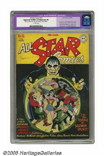 <B>All Star Comics #33 (DC, 1947) CGC Apparent VF/NM 9.0 Moderate (P) Off-white pages.</B></I> This is one of the most sought-after issues of <B>All Star</B></I>'s run, thanks to the last Golden Age appearance of Solomon Grundy. The villain gives the Justice Society all they can handle here, in a book-length feature with different artists drawing different chapters (an <B>All Star</B></I> tradition). Joe Kubert is the most notable artist, and we should also note that Green Lantern's streetwise pal Doiby Dickles guest stars. CGC notes, "Restoration includes: color touch, pieces added, tear seals, reinforced." Overstreet 2005 GD 2.0 value = $345; VG 4.0 value = $690; FN 6.0 value = $1,035; VF 8.0 value = $2,243; VF/NM 9.0 value = $3,622.