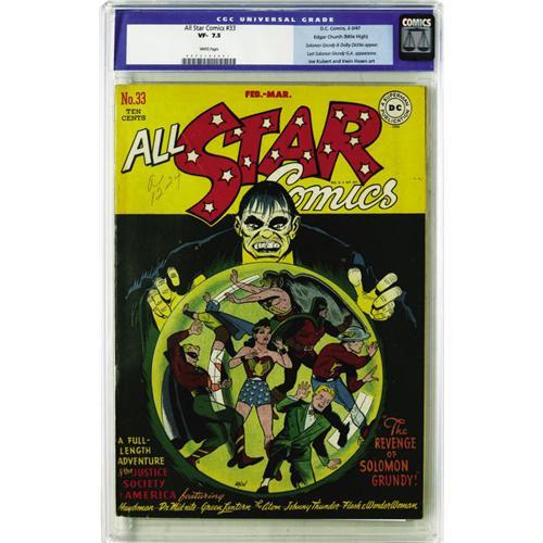 <B>All Star Comics #33 Mile High pedigree (DC, 1947) CGC VF- 7.5 White pages.</B></I> Solomon Grundy was a fantastic villain who unfortunately only appeared a handful of times in the Golden Age, and this was his last appearance of that era. Also guest-starring is Green Lantern's streetwise pal Doiby Dickles. As was the rule for this title, different artists drew different chapters; Joe Kubert stands out among this book's contributors. This copy has a few dings, keeping it out of Edgar Church's usual NM territory, but the typically brilliant Mile High colors and white pages are present and accounted for. Overstreet 2006 VF 8.0 value = $2,262. CGC census 6/06: 2 in 7.5, 9 higher. <BR><BR><B>Important notice:</B> Heritage usually auctions material at the rate of 200-250 lots per hour. On some occasions eBay Live bid software or the Internet may not be able to keep up with the pace of the auction. We recommend placing a realistic absentee bid now as insurance to avoid disappointment. Occasionally the auctioneer may eliminate or reject an eBay Live bid, and the auctioneer may also reopen a lot after the close of the eBay live bidding (usually because we missed an audience bid), and may reject your bid even if it shows you as the winning bidder. By bidding via eBay Live, you agree that Heritage may award the lot to another bidder at its sole discretion under the circumstances described above or any other reasonable circumstances. Since eBay bids are not shown to us until we open the lot on the floor, we treat those bids just like floor bids. In most cases the floor responds before the eBay bid is presented to us, due to Internet lag time, so for consistency we have made it a policy that floor bids are always considered first over tie eBay live bids. Also please note that all Heritage lots purchased through eBay Live carry a 22.5% Buyer's Premium. Please make sure you read the Terms and Conditions before you bid. This lot is being auctioned in conjunction with a live floor auction by Heritage Auction Galleries. All final auction and invoice information will be supplied by Heritage Auction Galleries, and all other information should be considered preliminary. Lot:41001 <BR><BR><B>Winning Notification and Billing:</B> After the FINAL session in this auction is complete, Heritage will send e-mail and snail mail invoices. This process normally takes several days. All final auction and invoice information will be supplied by Heritage Auction Galleries, and all other information should be considered preliminary. <BR><BR>This auction will be conducted on a live auction floor and over the Internet through eBay Live. If you choose to place an absentee bid, please take a moment to <font color='#0000ff'><u><a href='http://pages.ebay.com/liveauctions/help/before/laabsentee.html'>learn how eBay Live absentee bidding works</a></u></font><font color='#000000'>