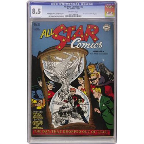 <B>All Star Comics #35 (DC, 1947) CGC VF+ 8.5 Off-white pages.</B></I> High grade copy of an issue that featured the first appearance of Per Degaton and a Johnny Thunder cameo, in addition to the usual crowded field of superheroes -- the Flash, Green Lantern, Hawkman, Dr. Mid-Nite, the Atom, and Wonder Woman. Irwin Hasen did the cover; Hasen, Joe Kubert, and Lee Elias provided interior art. Overstreet 2007 VF 8.0 value = $738; VF/NM 9.0 value = $1,194. CGC census 5/07: 3 in 8.5, 5 higher.<BR><BR><b>Shipping:</b> Comics - Slabbed (certified) (<a target="_blank" href="http://www.heritageauctions.com/common/shipping.php">view shipping information</a>)