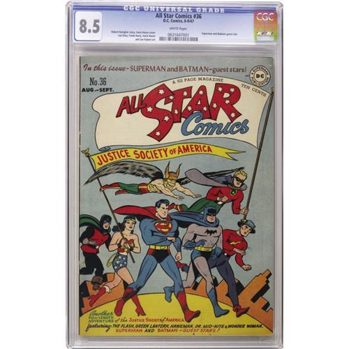 <B>All Star Comics #36 (DC, 1947) CGC VF+ 8.5 White pages.</B></I> Just two copies have earned higher grades from CGC to date than this high-grade copy. Irwin Hasen created the cover, and Hasen, Lee Elias, Frank Harry, and Joe Kubert did the interior art for this issue, which had Superman and Batman guest starring. Overstreet 2006 VF 8.0 value = $1,738; VF/NM 9.0 value = $2,744. CGC census 10/06: 2 in 8.5, 2 higher.<BR><BR><b>Shipping:</b> Slabbed Comic (<a target="_blank" href="http://www.heritageauctions.com/common/shipping.php">view shipping information</a>)