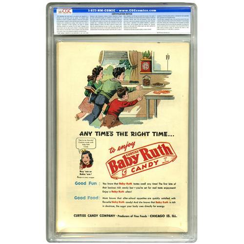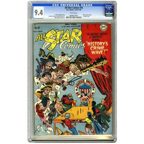 <B>All Star Comics #38 (DC, 1947) CGC NM 9.4 White pages.</B></I> Roy Thomas calls this issue "the weirdest <B>All-Star</B></I> ever" -- it begins with the male JSAers all being killed! Saving the day is left up to Black Canary (who makes her debut in this title) and Wonder Woman (who rarely played a prominent role in a JSA story, but takes center stage here). The issue is also notable for having early Alex Toth art -- the great one was still a teenager when he drew this issue's cover. Toth also drew the beginning and end of the story; the middle portions are the work of Carmine Infantino and Bob Oksner respectively. Only one copy of this issue has been certified with a higher grade by CGC to date. Overstreet 2006 NM- 9.2 value = $2,500. CGC census 3/06: 1 in 9.4, 1 higher.