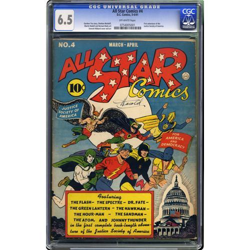 <B>All Star Comics #4 (DC, 1941) CGC FN+ 6.5 Off-white pages.</B></I> It's the first adventure of the Justice Society! Of course, #3 was the first <I>appearance</B></I> of the group, but all they did in #3 was sit at the table and tell stories! Here, they spring into action to battle some Nazi types on American soil. In the fashion that would become standard for this title, each chapter was drawn by a different artist, including E. E. Hibbard (who also drew the cover), Martin Nodell, Bernard Baily, and Sheldon Moldoff. Overstreet 2006 FN 6.0 value = $1,572; VF 8.0 value = $3,668. CGC census 2/06: 1 in 6.5, 10 higher. <I>From the Collection of Harold Curtis.</B></I>
