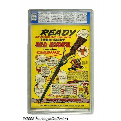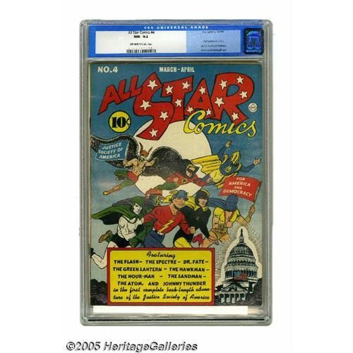 <B>All Star Comics #4 (DC, 1941) CGC NM- 9.2 Off-white to white pages.</B></I> After the pomp and circumstance of the origin and first appearance of the JSA in the previous issue, the superheroes get down to business and enjoy their first adventure. E. E. Hibbard provided the inspiring cover, while Bernard Baily and Sheldon Moldoff did the interior art. This beauty is currently tied with one other copy as the highest-graded in CGC's census. Overstreet 2005 NM- 9.2 value = $8,100. CGC census 9/05: 2 in 9.2, none higher. <BR><BR><B>Important notice:</B> Heritage usually auctions material at the rate of 200-250 lots per hour. On some occasions eBay Live bid software or the Internet may not be able to keep up with the pace of the auction. We recommend placing a realistic absentee bid now as insurance to avoid disappointment. Occasionally the auctioneer may eliminate or reject an eBay Live bid, and the auctioneer may also reopen a lot after the close of the eBay live bidding (usually because we missed an audience bid), and may reject your bid even if it shows you as the winning bidder. By bidding via eBay Live, you agree that Heritage may award the lot to another bidder at its sole discretion under the circumstances described above or any other reasonable circumstances. Since eBay bids are not shown to us until we open the lot on the floor, we treat those bids just like floor bids. In most cases the floor responds before the eBay bid is presented to us, due to Internet lag time, so for consistency we have made it a policy that floor bids are always considered first over tie eBay live bids. Also please note that all Heritage lots purchased through eBay Live carry a 20% Buyer's Premium. Please make sure you read the Terms and Conditions before you bid. This lot is being auctioned in conjunction with a live floor auction by Heritage Galleries & Auctioneers. All final auction and invoice information will be supplied by Heritage Galleries & Auctioneers, and all other informat