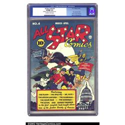 All Star Comics #4 (DC, 1941) CGC VF/NM 9.0 Off-white to white pages. The JSA launch into their second adventure with this issue, declaring their mission to be "For America and Democracy." This copy has deep colors and a perfect spine, and was downgraded only because of a rounded corner due to the printing process. Overstreet 2002 NM 9.4 value = $6,600. Important notice: We expect to be auctioning lots at the rate of 200-250 per hour. Sometimes eBay Premier live bid software cannot keep up with that pace, so we strongly recommend that you place a realistic proxy bid now as insurance to avoid disappointment. Also please note that all Heritage/CAA lots purchased through eBay Premier carry a 20% Buyer's Premium. Please make sure you read the Terms and Conditions.