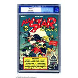 All Star Comics #4 Rockford pedigree (DC, 1941) CGC NM- 9.2 Off-white to white pages. Following the first appearance of the Justice Society of America in the previous issue, the JSA has its first full adventure in this issue. E. E. Hibbard of Golden Age Flash fame provides the patriotic cover of the JSA speeding into action with the Capitol in the background. The Rockford collection comes through again with the finest copy yet graded of this issue by CGC. Overstreet 2002 NM 9.4 value = $6,600. Important notice: We expect to be auctioning lots at the rate of 200-250 per hour. Sometimes eBay Premier live bid software cannot keep up with that pace, so we strongly recommend that you place a realistic proxy bid now as insurance to avoid disappointment. Also please note that all Heritage/CAA lots purchased through eBay Premier carry a 20% Buyer's Premium. Please make sure you read the Terms and Conditions.