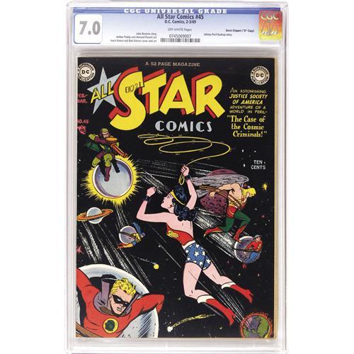 <B>All Star Comics #45 Davis Crippen ("D" Copy) pedigree (DC, 1949) CGC FN/VF 7.0 Off-white pages.</B></I> Where <I>are</B></I> all of the copies of this issue, for goodness' sake? This is the "comic series of kings," <B>All Star</B></I>, and yet we haven't seen a copy of #45 change hands in any venue lately. While problem #1 is finding a copy, problem #2 would be finding one without all sorts of color breaks on the black spine. Consider both missions accomplished here! Irwin Hasen drew this issue's cover and much of the accompanying story as well. Overstreet 2006 FN 6.0 value = $339; VF 8.0 value = $706. CGC census 6/06: 1 in 7.0, 3 higher. <I>From the Crippen Collection.</B></I> <BR><BR><B>Important notice:</B> Heritage usually auctions material at the rate of 200-250 lots per hour. On some occasions eBay Live bid software or the Internet may not be able to keep up with the pace of the auction. We recommend placing a realistic absentee bid now as insurance to avoid disappointment. Occasionally the auctioneer may eliminate or reject an eBay Live bid, and the auctioneer may also reopen a lot after the close of the eBay live bidding (usually because we missed an audience bid), and may reject your bid even if it shows you as the winning bidder. By bidding via eBay Live, you agree that Heritage may award the lot to another bidder at its sole discretion under the circumstances described above or any other reasonable circumstances. Since eBay bids are not shown to us until we open the lot on the floor, we treat those bids just like floor bids. In most cases the floor responds before the eBay bid is presented to us, due to Internet lag time, so for consistency we have made it a policy that floor bids are always considered first over tie eBay live bids. Also please note that all Heritage lots purchased through eBay Live carry a 22.5% Buyer's Premium. Please make sure you read the Terms and Conditions before you bid. This lot is being auctioned in conjunction with a live floor auction by Heritage Auction Galleries. All final auction and invoice information will be supplied by Heritage Auction Galleries, and all other information should be considered preliminary. Lot:41001 <BR><BR><B>Winning Notification and Billing:</B> After the FINAL session in this auction is complete, Heritage will send e-mail and snail mail invoices. This process normally takes several days. All final auction and invoice information will be supplied by Heritage Auction Galleries, and all other information should be considered preliminary. <BR><BR>This auction will be conducted on a live auction floor and over the Internet through eBay Live. If you choose to place an absentee bid, please take a moment to <font color='#0000ff'><u><a href='http://pages.ebay.com/liveauctions/help/before/laabsentee.html'>learn how eBay Live absentee bidding works</a></u></font><font color='#000000'>