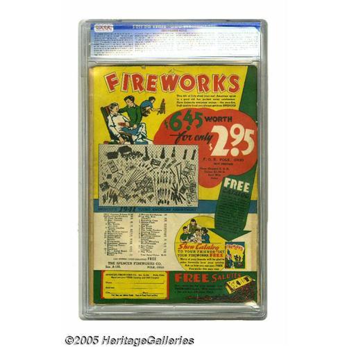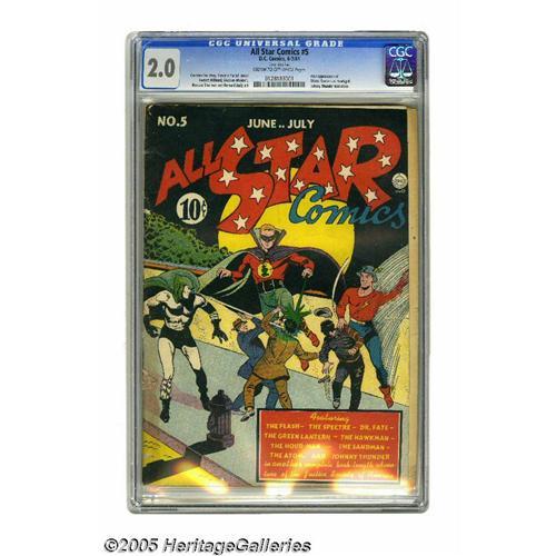 <B>All Star Comics #5 (DC, 1941) CGC GD 2.0 Cream to off-white pages.</B></I> Considered the first costumed superheroine, Shiera Sanders makes her first appearance as Hawkgirl in this issue. Howard Purcell comes up with a nice action cover, while Sheldon Moldoff, Bernard Baily, Howard Sherman, and E. E. Hibbard help with interior art. Overstreet 2005 GD 2.0 value = $439. CGC census 7/05: 1 in 2.0, 22 higher. <I>From the Aviator Collection</B></I>. <BR><BR><B>Important notice:</B> Heritage usually auctions material at the rate of 200-250 lots per hour. On some occasions eBay Live bid software or the Internet may not be able to keep up with the pace of the auction. We recommend placing a realistic absentee bid now as insurance to avoid disappointment. Occasionally the auctioneer may eliminate or reject an eBay Live bid, and the auctioneer may also reopen a lot after the close of the eBay live bidding (usually because we missed an audience bid), and may reject your bid even if it shows you as the winning bidder. By bidding via eBay Live, you agree that Heritage may award the lot to another bidder at its sole discretion under the circumstances described above or any other reasonable circumstances. Since eBay bids are not shown to us until we open the lot on the floor, we treat those bids just like floor bids. In most cases the floor responds before the eBay bid is presented to us, due to Internet lag time, so for consistency we have made it a policy that floor bids are always considered first over tie eBay live bids. Also please note that all Heritage lots purchased through eBay Live carry a 20% Buyer's Premium. Please make sure you read the Terms and Conditions before you bid. This lot is being auctioned in conjunction with a live floor auction by Heritage Galleries & Auctioneers. All final auction and invoice information will be supplied by Heritage Galleries & Auctioneers, and all other information should be considered preliminary. Lot:3006 <BR><BR><B>Winning Notific
