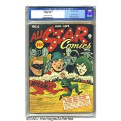 All Star Comics #6 (DC, 1941) CGC FN/VF 7.0 Off-white to white pages. In this issue, Johnny Thunder is initiated into the Justice Society. It's not like he has to learn all sorts of established traditions; the rest of the group has only been together for three issues themselves! Brought to you from the drawing boards of Bernard Baily and Shelly Moldoff. Overstreet 2003 FN 6.0 value = $900; VF 8.0 value = $1,875. Important notice: Heritage usually auctions material at the rate of 200-250 lots per hour. On some occasions eBay Live bid software or the Internet may not be able to keep up with the pace of the auction. We recommend placing a realistic absentee bid now as insurance to avoid disappointment. Occasionally the auctioneer may eliminate or reject an eBay Live bid, and the auctioneer may also reopen a lot after the close of the eBay live bidding (usually because we missed an audience bid), and may reject your bid even if it shows you as the winning bidder. By bidding via eBay Live, you agree that Heritage may award the lot to another bidder at its sole discretion under the circumstances described above or any other reasonable circumstances. Since eBay bids are not shown to us until we open the lot on the floor, we treat those bids just like floor bids. In most cases the floor responds before the eBay bid is presented to us, due to Internet lag time, so for consistency we have made it a policy that floor bids are always considered first over tie eBay live bids. Also please note that all Heritage lots purchased through eBay Live carry a 20% Buyer's Premium. Please make sure you read the Terms and Conditions before you bid.