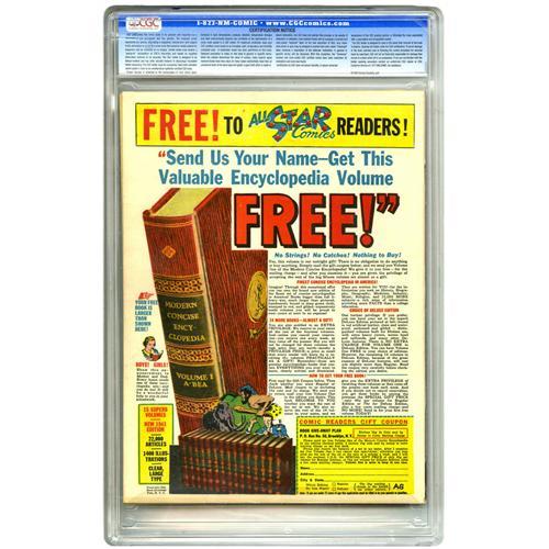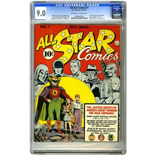 <B>All Star Comics #7 (DC, 1941) CGC VF/NM 9.0 Off-white to white pages.</B></I> This copy's just one grade below the highest CGC has assigned, and it's not readily apparent what separates this book from a 9.2 grade -- the spine looks fantastic! In addition to featuring the usual Justice Society action, this issue's notable for being the first time Batman and Superman ever appeared together in a story (they pop in for a couple of panels). The issue has an E. E. Hibbard cover, with interior art by an assortment that includes Hibbard, Bernard Baily, and Sheldon Moldoff. Overstreet 2006 VF/NM 9.0 value = $3,620; NM- 9.2 value = $5,100. CGC census 4/06: 3 in 9.0, 3 higher.