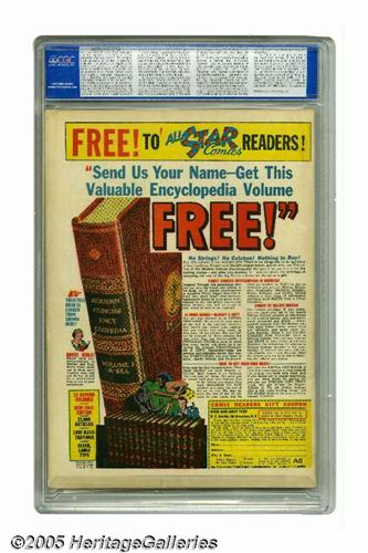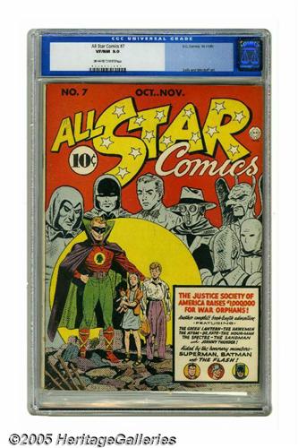 <B>All Star Comics #7 (DC, 1941) CGC VF/NM 9.0 Off-white to white pages.</B></I> Just a shade below the highest grade (NM- 9.2) that CGC has certified to date for issue #7, this copy sparkles. E. E. Hibbard created the cover, and Bernard Baily and Sheldon Moldoff offered story art. Overstreet 2005 VF/NM 9.0 value = $3,441; NM- 9.2 value = $4,750. CGC census 5/05: 3 in 9.0, 3 higher.