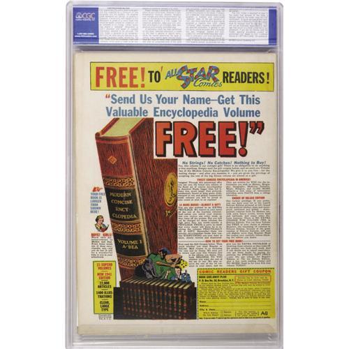 <B>All Star Comics #7 (DC, 1941) CGC VF/NM 9.0 Off-white to white pages.</B></I> Batman and Superman together in a story for the first time ever! Yes, believe it or not, it happened right here in <B>All Star</B></I>, with the duo appearing for all of three panels thanks to -- what else? -- Johnny Thunder wishing they would appear (the Flash pops in as well). The issue, which looks at the plight of war orphans, has an E. E. Hibbard cover, with interior art by Hibbard, Martin Nodell, Bernard Baily, Sheldon Moldoff, and more. Overstreet 2006 VF/NM 9.0 value = $3,620; NM- 9.2 value = $5,100. CGC census 10/06: 3 in 9.0, 3 higher.<BR><BR><b>Shipping:</b> Slabbed Comic (<a target="_blank" href="http://www.heritageauctions.com/common/shipping.php">view shipping information</a>)