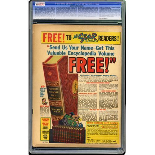 <B>All Star Comics #7 (DC, 1941) CGC VG/FN 5.0 Off-white to white pages.</B></I> Batman and Superman together in a story for the first time ever! Yes, believe it or not, it happened right here in <B>All Star</B></I>, with the duo appearing for all of three panels thanks to -- what else? -- Johnny Thunder <I>wishing</B></I> they would appear (the Flash pops in as well). The issue, which looks at the plight of war orphans, has an E. E. Hibbard cover, with interior art by Hibbard, Martin Nodell, Bernard Baily, Sheldon Moldoff, and more. Overstreet 2006 VG 4.0 value = $658; FN 6.0 value = $987. CGC census 2/06: 2 in 5.0, 15 higher. <I>From the Collection of Harold Curtis.</B></I>