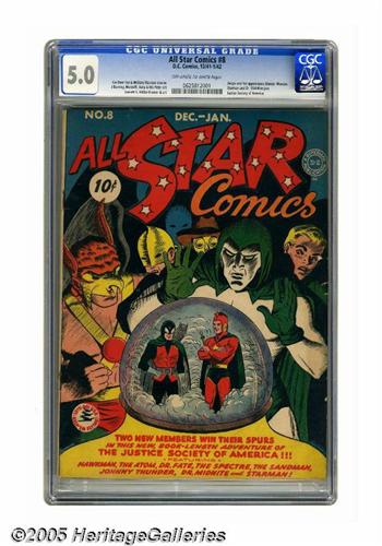 <B>All Star Comics #8 (DC, 1942) CGC VG/FN 5.0 Off-white to white pages.</B></I> Why is this issue on Overstreet's list of the 30 most valuable comic books? You wouldn't know it by looking at the cover, but it has the first appearance and origin of Wonder Woman! This comic was released with an unusual page count of 72 pages, with the Amazon's origin added on to the book-length Justice Society feature. That has led some to speculate that the story was originally intended for <B>Sensation Comics</B></I> #1, with a last-minute decision to give the character exposure in a popular, established series. Whatever the case, the new heroine caused a sensation, making this one of the key Golden Age books. On the JSA front, Dr. Fate gets a new helmet, and Starman and Dr. Mid-Nite become members. The Wonder Woman story is of course by H. G. Peter, the cover is by E. E. Hibbard, and the JSA story has the usual format of different artists drawing each chapter, with Sheldon Moldoff, Jack Burnley, and Bernard Baily among them. Overstreet 2005 VG 4.0 value = $5,650; FN 6.0 value = $8,475. CGC census 4/05: 4 in 5.0, 10 higher.