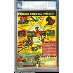All-Star Comics #8 (DC, 1942). Truly significant in the history of comic books, this issue contains the origin and first appearance of Wonder Woman. All-Star #8 seems to have more growth potential, in terms of value, than any other Golden Age key. Overstreet values for Wonder Woman keys are very low in comparison with the other DC stars, yet she is more enduring and more popular than many of those characters. This is a solid, lower grade copy, with typical defects for the grade such as a small chip out of the back cover (no label note). CGC VG- 3.5 Cream pages. Overstreet 2001 GD 2.0 value = $2,560; FN 6.0 value = $7,680. Important notice: We expect to be auctioning lots at the rate of 200-250 per hour. Sometimes eBay Premier live bid software cannot keep up with that pace, so we strongly recommend that you place a realistic proxy bid now as insurance to avoid disappointment. Also please note that all Heritage/CAA lots purchased through eBay Premier carry a 20% Buyer's Premium.