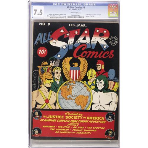 <B>All Star Comics #9 (DC, 1942) CGC VF- 7.5 Cream to off-white pages.</B></I> J. Edgar Hoover is made an associate member of the JSA in this issue, deciding upon a traditional male dress suit over his more frilly suit dress for the occasion. E. E. Hibbard cover with Hibbard, Bernard Baily, Howard Sherman, Sheldon Moldoff, and Jack Burnley providing interior art. Overstreet 2006 VF 8.0 value = $1,850. CGC census 10/06: 4 in 7.5, 4 higher.<BR><BR><b>Shipping:</b> Slabbed Comic (<a target="_blank" href="http://www.heritageauctions.com/common/shipping.php">view shipping information</a>)