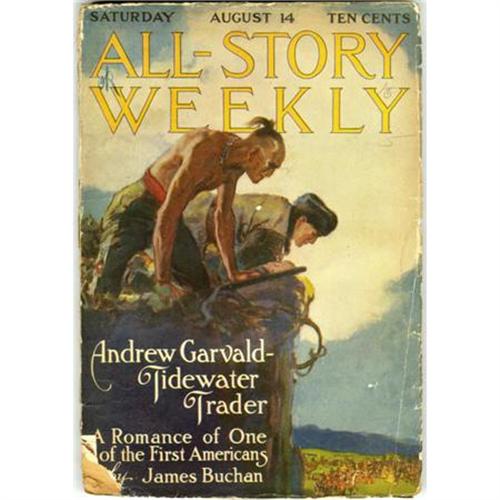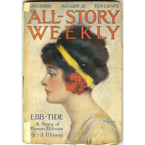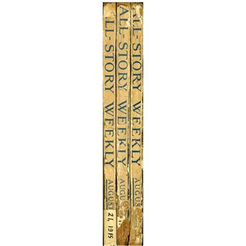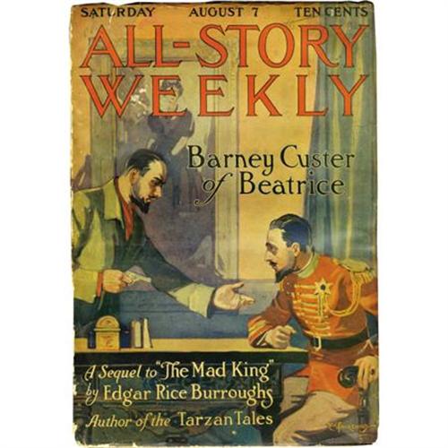 <B>All-Story Weekly "Barney Custer of Beatrice" Group (Munsey, 1915) Condition: Average GD/VG.</B></I> A complete collection of "Barney Custer of Beatrice," Edgar Rice Burroughs' sequel to "The Mad King." Included are the August 7, 14 (heavy chipping to lower left corner), and 21 (tape repair to spine), 1915 issues of <B>All-Story</B></I>. The August 14 issue also features the story "The Shadow of the Guillotine" by Rafael Sabatini (<I>The Seahawk</B></I>, <I>Scaramouche</B></I>, <I>Captain Blood</B></I>).<B> </B></I>Approximate Bookery's Guide to Pulps value for group = $600.<BR><BR><b>Shipping:</b> Books & Catalogs (<a target="_blank" href="http://www.heritageauctions.com/common/shipping.php">view shipping information</a>)