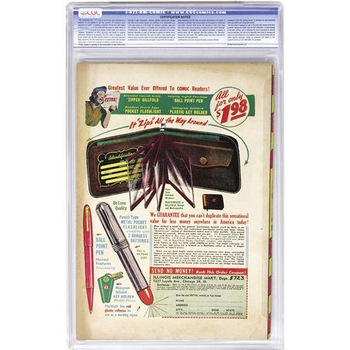 <B>All Top Comics #15 Davis Crippen ("D" Copy) pedigree (Fox Features Syndicate, 1949) CGC FN+ 6.5 Off-white to white pages.</B></I> Rulah, Jo-Jo, and Phantom Lady were the three top characters starring in this issue. Genre collectors will want to note the gorilla cover and the (interior) lingerie panels. Overstreet 2006 FN 6.0 value = $339; VF 8.0 value = $706. CGC census 6/06: 1 in 6.5, 2 higher. <I>From the Crippen Collection.</B></I> <BR><BR><B>Important notice:</B> Heritage usually auctions material at the rate of 200-250 lots per hour. On some occasions eBay Live bid software or the Internet may not be able to keep up with the pace of the auction. We recommend placing a realistic absentee bid now as insurance to avoid disappointment. Occasionally the auctioneer may eliminate or reject an eBay Live bid, and the auctioneer may also reopen a lot after the close of the eBay live bidding (usually because we missed an audience bid), and may reject your bid even if it shows you as the winning bidder. By bidding via eBay Live, you agree that Heritage may award the lot to another bidder at its sole discretion under the circumstances described above or any other reasonable circumstances. Since eBay bids are not shown to us until we open the lot on the floor, we treat those bids just like floor bids. In most cases the floor responds before the eBay bid is presented to us, due to Internet lag time, so for consistency we have made it a policy that floor bids are always considered first over tie eBay live bids. Also please note that all Heritage lots purchased through eBay Live carry a 22.5% Buyer's Premium. Please make sure you read the Terms and Conditions before you bid. This lot is being auctioned in conjunction with a live floor auction by Heritage Auction Galleries. All final auction and invoice information will be supplied by Heritage Auction Galleries, and all other information should be considered preliminary. Lot:41001 <BR><BR><B>Winning Notification and Billing:</B> After the FINAL session in this auction is complete, Heritage will send e-mail and snail mail invoices. This process normally takes several days. All final auction and invoice information will be supplied by Heritage Auction Galleries, and all other information should be considered preliminary. <BR><BR>This auction will be conducted on a live auction floor and over the Internet through eBay Live. If you choose to place an absentee bid, please take a moment to <font color='#0000ff'><u><a href='http://pages.ebay.com/liveauctions/help/before/laabsentee.html'>learn how eBay Live absentee bidding works</a></u></font><font color='#000000'>