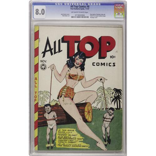 <B>All Top Comics #8 (Fox Features Syndicate, 1947) CGC VF 8.0 Off-white to white pages.</B></I> It's hard to believe Overstreet doesn't consider this Jack Kamen cover, featuring jungle queen Rulah and two hog-tied pygmies, a classic! We can assure you that among collectors of "good girl" art, it's deemed one of the best! Inside, there are appearances by Blue Beetle and Phantom Lady (probably the goodest "good girl" of all!). Matt Baker's art is featured. Overstreet 2006 VF 8.0 value = $1,619. CGC census 10/06: 2 in 8.0, 2 higher.<BR><BR><b>Shipping:</b> Slabbed Comic (<a target="_blank" href="http://www.heritageauctions.com/common/shipping.php">view shipping information</a>)