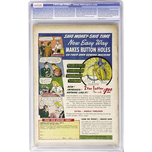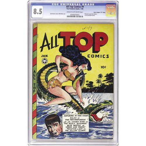 <B>All Top Comics #9 Davis Crippen ("D" Copy) pedigree (Fox Features Syndicate, 1948) CGC VF+ 8.5 Cream to off-white pages.</B></I> Rulah's appellation is "Jungle Goddess," and we won't dispute that after thrilling to Jack Kamen' s cover rendering of the athletic beauty. Appreciating flowers of femininity as we do, the news that Matt Baker art is inside the comic only broadened the smiles on our faces. The characters appearing within include Phantom Lady, Blue Beetle, and Jo-Jo. Overstreet 2006 VF 8.0 value = $831; VF/NM 9.0 value = $1,316. CGC census 6/06: 1 in 8.5, 2 higher. <I>From the Crippen Collection.</B></I> <BR><BR><B>Important notice:</B> Heritage usually auctions material at the rate of 200-250 lots per hour. On some occasions eBay Live bid software or the Internet may not be able to keep up with the pace of the auction. We recommend placing a realistic absentee bid now as insurance to avoid disappointment. Occasionally the auctioneer may eliminate or reject an eBay Live bid, and the auctioneer may also reopen a lot after the close of the eBay live bidding (usually because we missed an audience bid), and may reject your bid even if it shows you as the winning bidder. By bidding via eBay Live, you agree that Heritage may award the lot to another bidder at its sole discretion under the circumstances described above or any other reasonable circumstances. Since eBay bids are not shown to us until we open the lot on the floor, we treat those bids just like floor bids. In most cases the floor responds before the eBay bid is presented to us, due to Internet lag time, so for consistency we have made it a policy that floor bids are always considered first over tie eBay live bids. Also please note that all Heritage lots purchased through eBay Live carry a 22.5% Buyer's Premium. Please make sure you read the Terms and Conditions before you bid. This lot is being auctioned in conjunction with a live floor auction by Heritage Auction Galleries. All final auction and invoice information will be supplied by Heritage Auction Galleries, and all other information should be considered preliminary. Lot:41001 <BR><BR><B>Winning Notification and Billing:</B> After the FINAL session in this auction is complete, Heritage will send e-mail and snail mail invoices. This process normally takes several days. All final auction and invoice information will be supplied by Heritage Auction Galleries, and all other information should be considered preliminary. <BR><BR>This auction will be conducted on a live auction floor and over the Internet through eBay Live. If you choose to place an absentee bid, please take a moment to <font color='#0000ff'><u><a href='http://pages.ebay.com/liveauctions/help/before/laabsentee.html'>learn how eBay Live absentee bidding works</a></u></font><font color='#000000'>