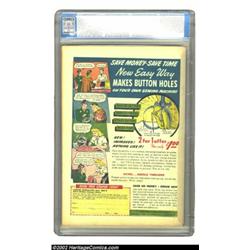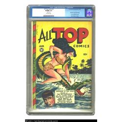 All Top Comics #9 (Fox Features Syndicate, 1948) CGC VF/NM 9.0 Off-white pages. The title started as a funny animal venue, but is known for its revamped lineup and direction beginning with issue #8 -- and especially for its sensational covers by Jack Kamen, renowned for his "good girl" treatment of Rulah, as shown here. A high-grade Fox from this era is rare; this copy is one of only three copies of issue #9 having been graded Very Fine or better. Overstreet 2002 NM 9.4 value = $1,400. Important notice: We expect to be auctioning lots at the rate of 200-250 per hour. Sometimes eBay Premier live bid software cannot keep up with that pace, so we strongly recommend that you place a realistic proxy bid now as insurance to avoid disappointment. Also please note that all Heritage/CAA lots purchased through eBay Premier carry a 20% Buyer's Premium. Please make sure you read the Terms and Conditions.