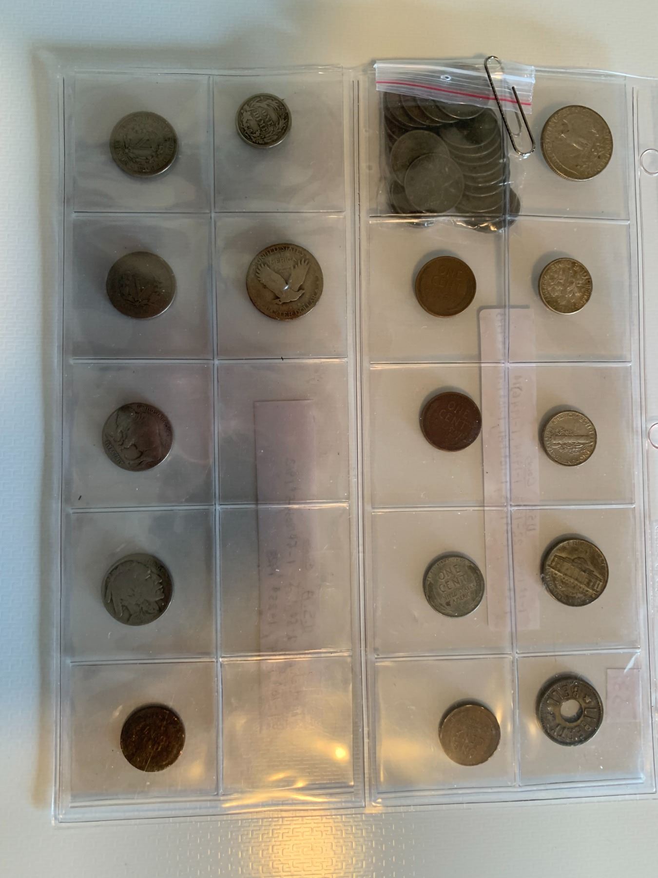 (All U.S. Coins) 1 - 1940 1c, 22 - 1943 (Steel) 1c, 1 - 1944 1c, 1 - 1946 1c, 1 - hole 5c, 1 - 1943 5c, 1 - 1941 10c, 1 - 1946 10c, 1 - 1943 25c.